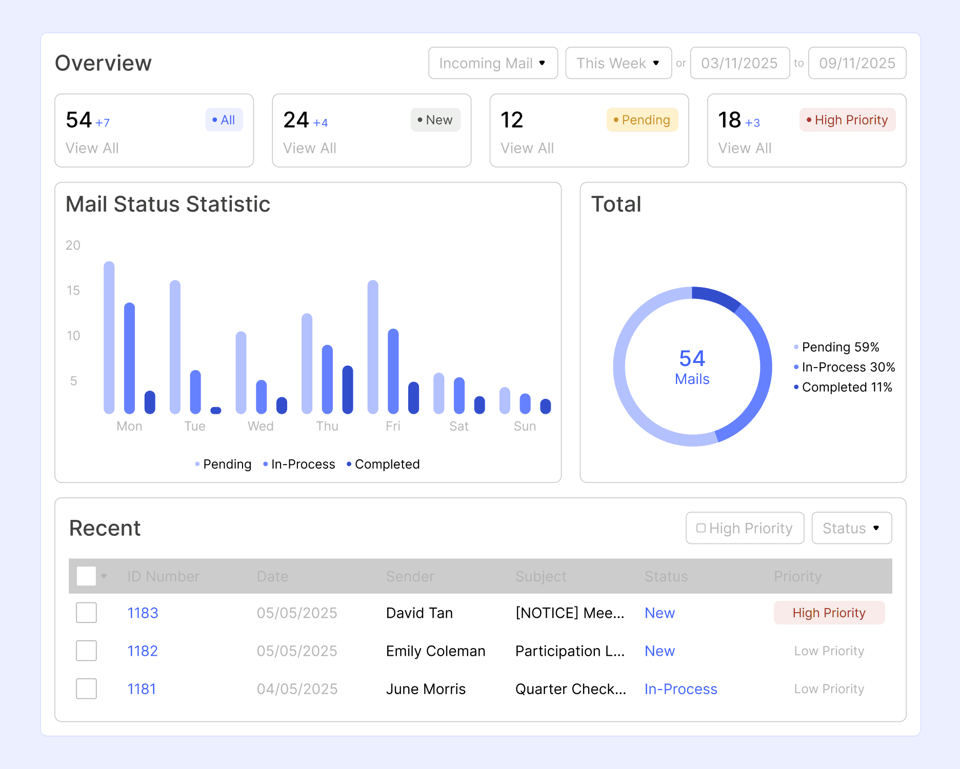 Incoming mail is recorded with essential info, attachments, deadlines, and tags — so documents never disappear into drawers or inbox clutter.