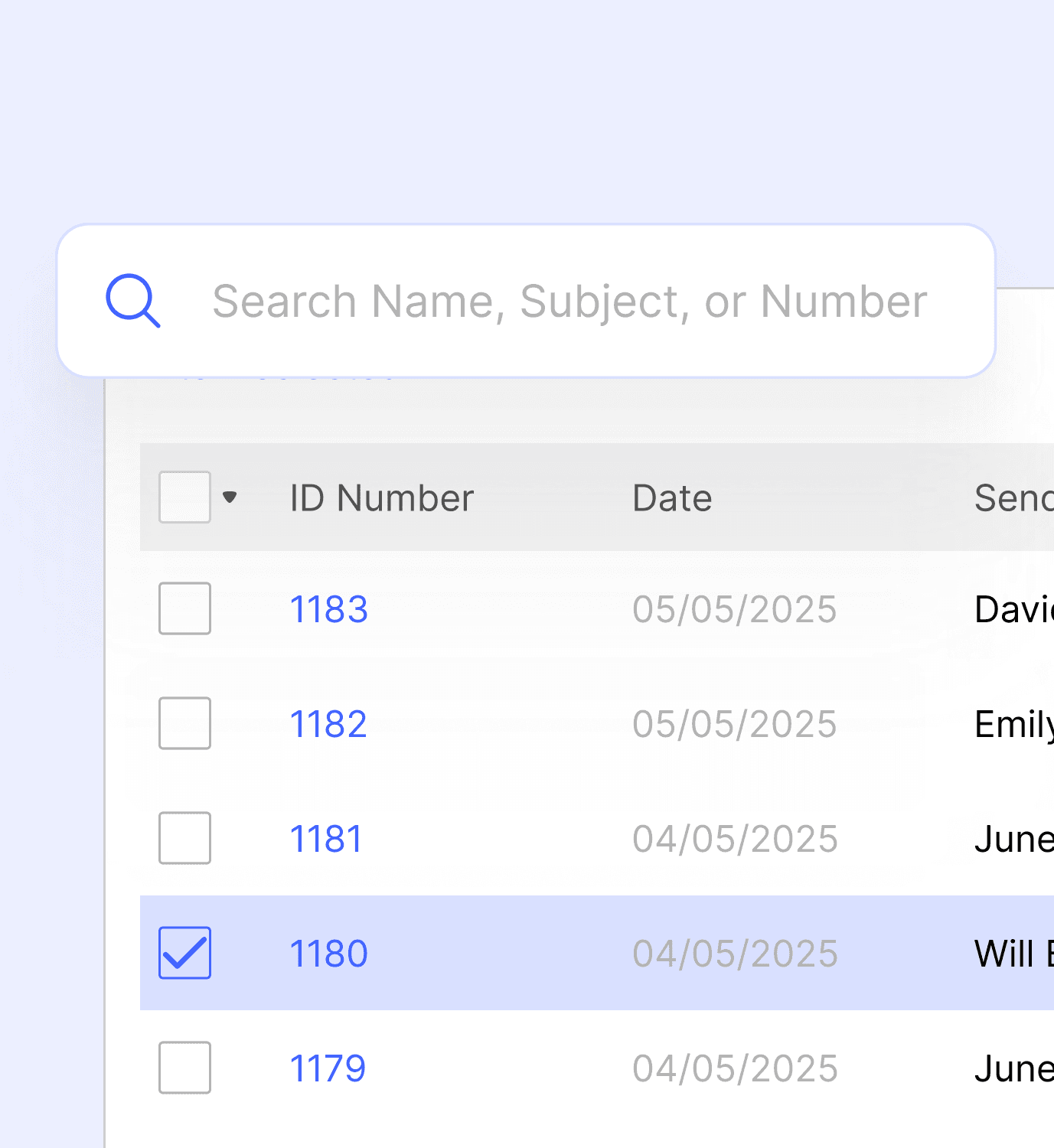 One search bar to find any document, status, recipient, or reference — no more hunting through folders or message threads.